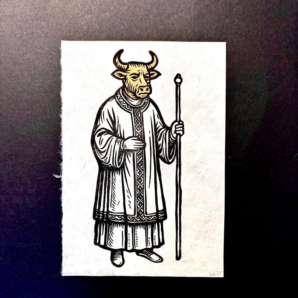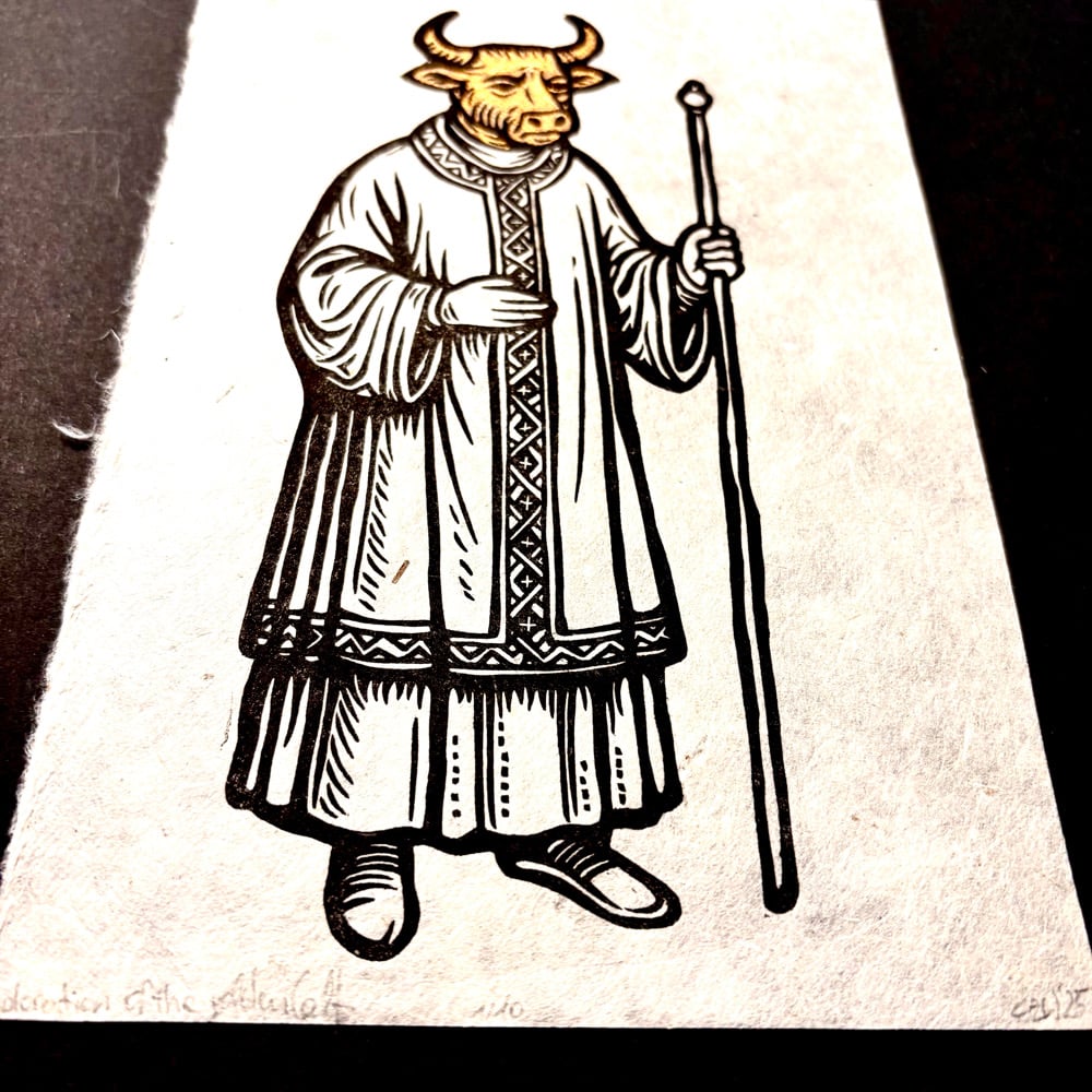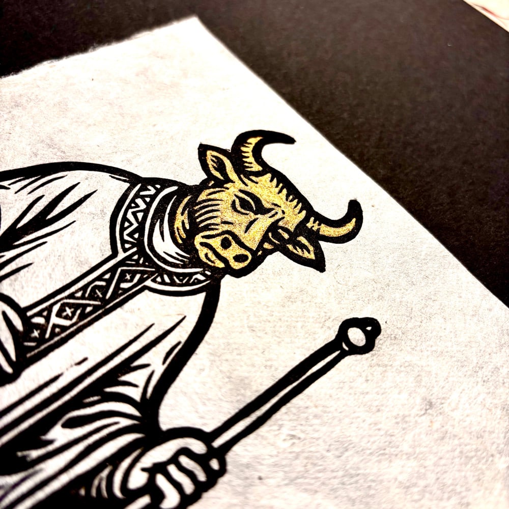 Linoldruck auf Büttenpapier (Lokta, 30gsm). 14,8x21cm, vergoldet.